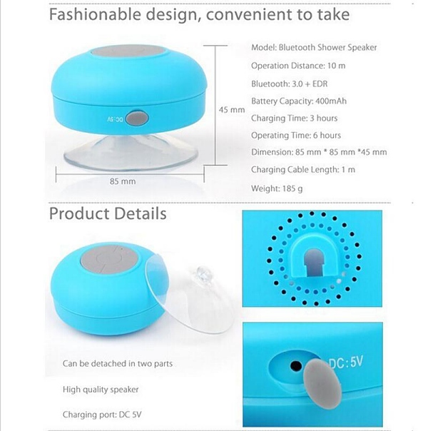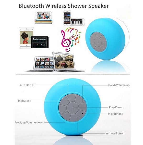 - Wireless and portable speakerphone with built-in microphone and suction cup for Shower, Car, Bathroom, Pool, Boat, Beach, both outdoor and indoor use.